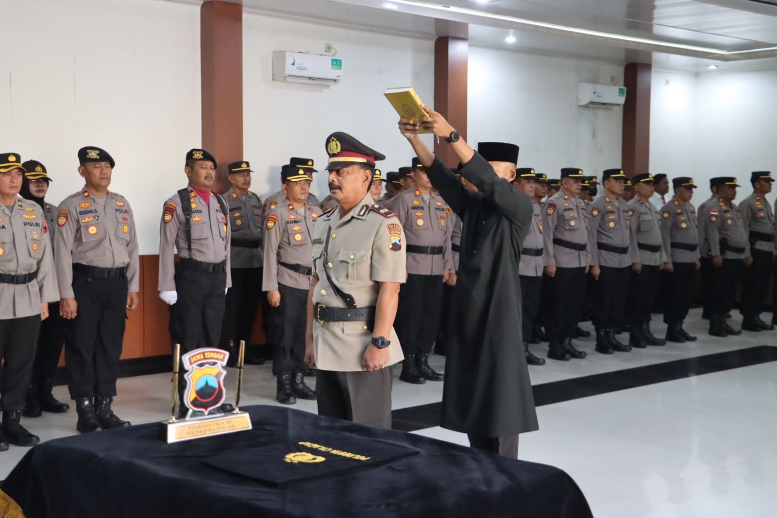 Kapolresta Cilacap Kombes Pol Dr Ruruh Wicaksono, S.I.K., S.H., M.H, memimpin upacara pelantikan Kapolsek Cimanggu yang berlangsung pada Senin, (15/07/2024), di Aula Patriatama Polresta Cilacap.