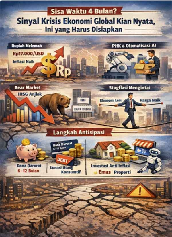 Radjawalipost, Jakarta – Sinyal krisis ekonomi global disebut makin nyata dan bahkan disebut tinggal menunggu waktu. Sejumlah indikator mulai menunjukkan tekanan serius, mulai dari pelemahan rupiah, gejolak pasar saham, hingga ancaman gelombang pemutusan hubungan kerja (PHK) akibat disrupsi teknologi, Minggu (22/3/2026).