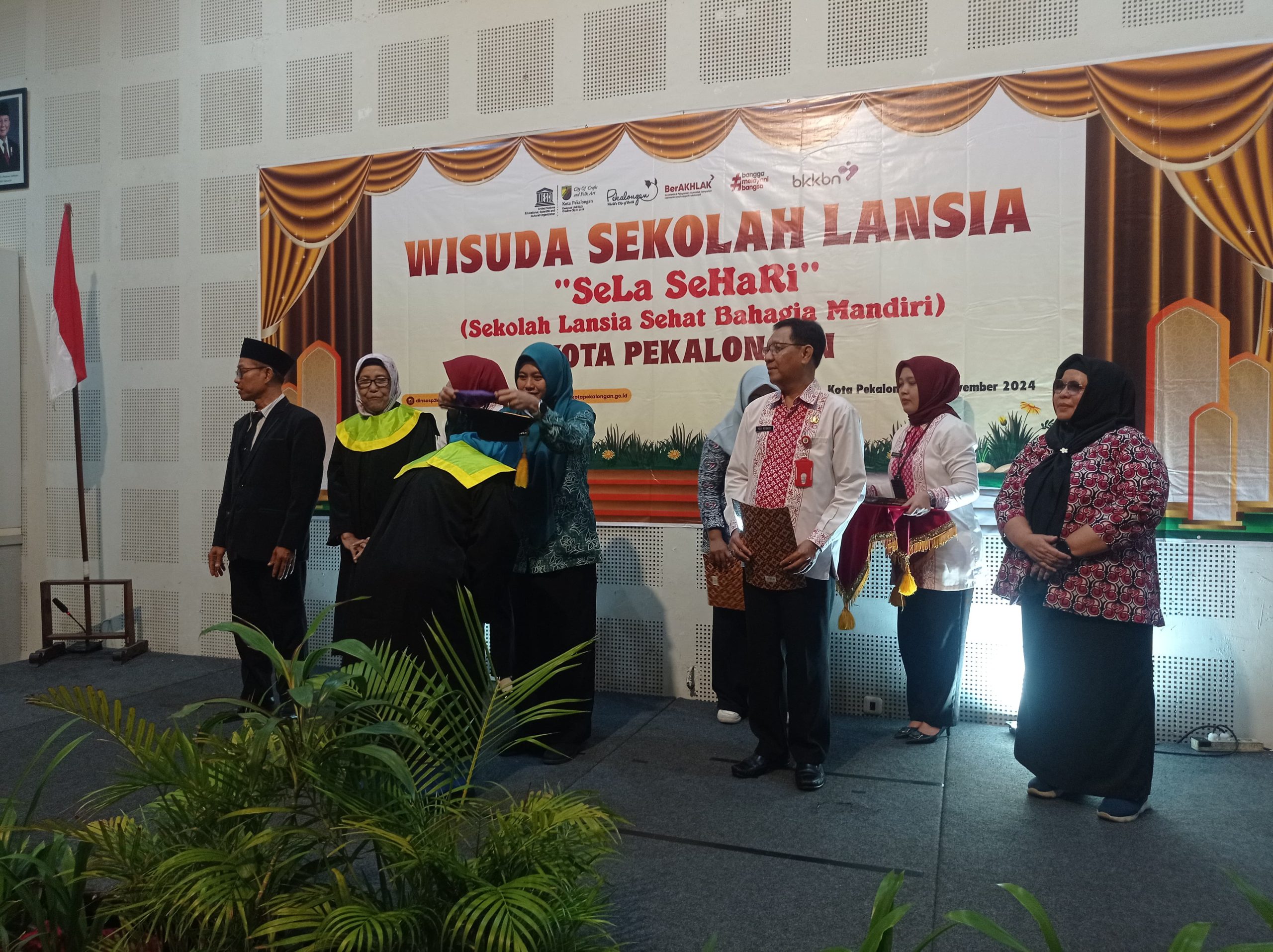 Pemerintah Kota Pekalongan melalui Dinas Sosial, Pengendalian Penduduk dan Keluarga Berencana (Dinsos-P2KB) mewisuda 111 lansia yang telah menempuh pendidikan di Sekolah Lansia Sehat Bahagia Mandiri (SeLa SeHaRi) Anggrek dan Qonitatun Nisa’. Acara wisuda berlangsung di Hotel Howard Johnson, Selasa (5/11/2024), dan dihadiri oleh Plt Walikota Pekalongan Salahudin, Kepala Dinsos-P2KB Yos Rosidi, Plh. TP PKK Istiqomah, Kepala Sekolah Lansia Bonari, dan Kepala Perwakilan BKKBN Provinsi Jawa Tengah, Eka Sulistia Ediningsih, serta tamu undangan lainnya.