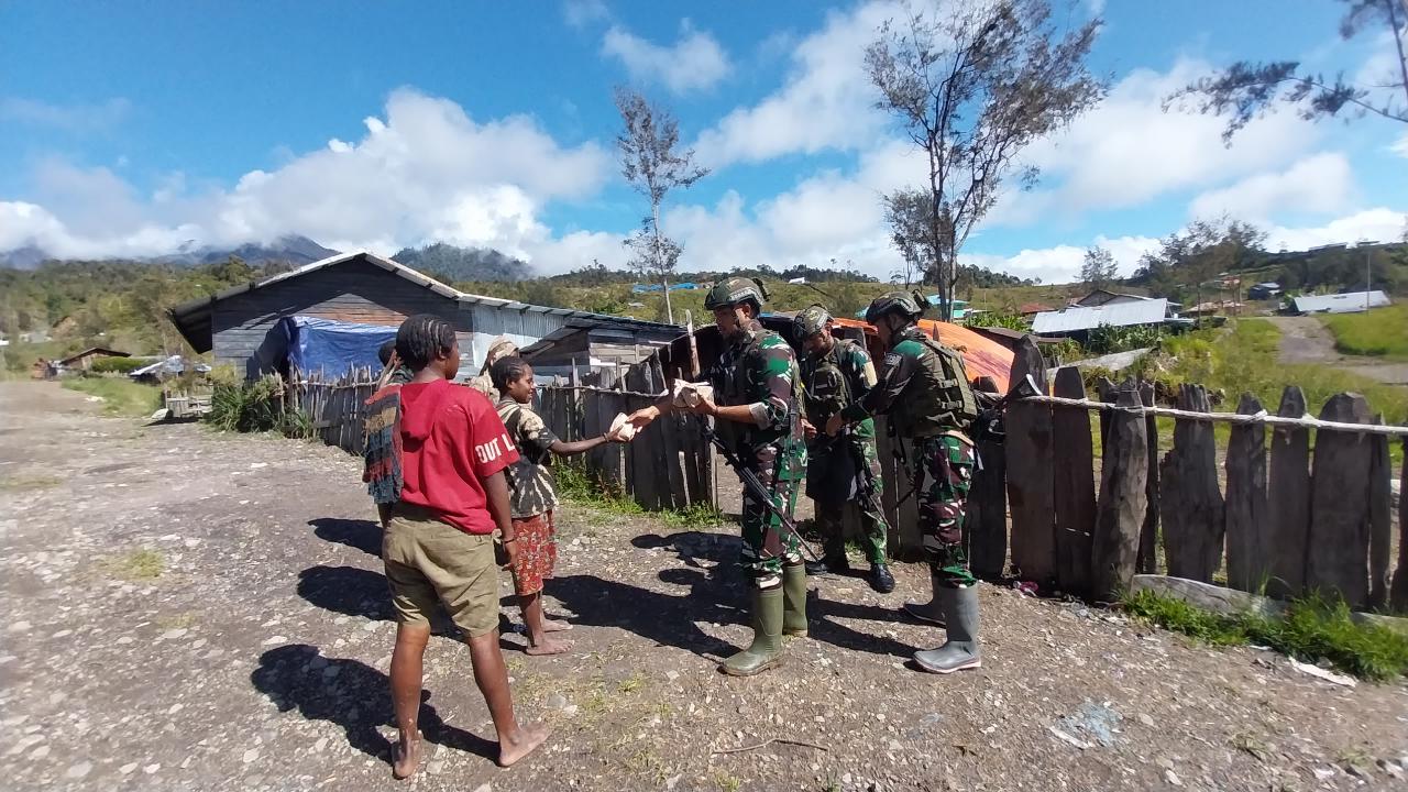 Prajurit Satgas Pamtas RI-PNG Mobile Yonif 323/BP Kostrad Pos Sinak Bandara Melaksanakan Kegiatan Minggu Kasih dengan membagikan Nasi Bungkus Kepada Masyarakat yang lewat Depan Pos, Distrik Sinak, Kab.Puncak, Papua, Minggu (30/06/2024)