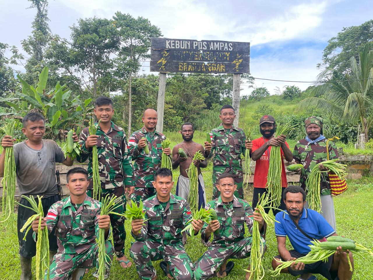 Pos Ampas Satgas Yonif 122 / TS melaksanakan panen kacang panjang bersama masyarakat untuk mewujudkan kedekatan personel Satgas Yonif 122 / TS dengan masyarakat Kampung Ampas, Distrik Waris, Kabupaten Keerom, Papua, Kamis (18-07-2024 )